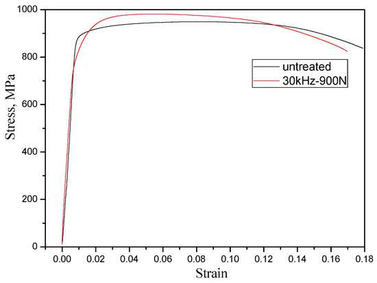 The stress strain curves for the MUSR-treated sample at 900 N and untreated sample.
