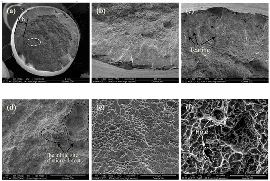 Tensile fracture morphologies of the MUSR-treated sample: (a) 50×; (b) cleavage; (c) tearing; (d) the crack initial site (white region in (a)); (e) dimples in the surface modification layer; (f) dimples and holes in the inner material substrate.