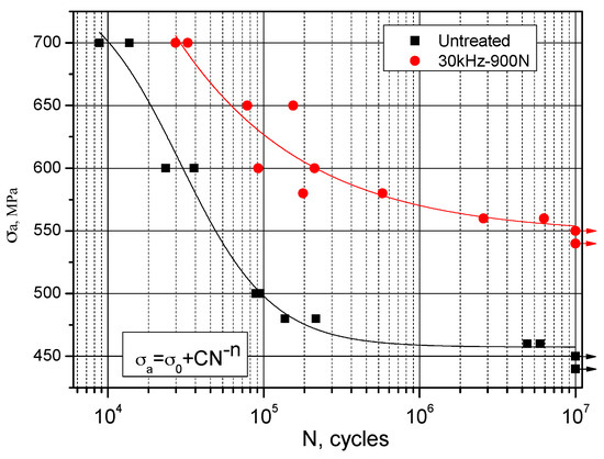 The stress/life fatigue behaviors of MUSR-treated samples at 900 N and untreated samples are compared in a form of Wöhler S–N curve in Figure 11. MUSR treatment leads to a significant increase in fatigue strength and enhances the fatigue lifetime, particularly in the high-cycle fatigue regime. Compared with the fatigue strength (465 MPa) of untreated samples, there is about a 25% increase for the fatigue strength (560 MPa) of MUSR-treated samples on the base of 107 cycles. The main effect range of MUSR treatment on fatigue lifetime is between 560 MPa and 650 MPa. The increased degree of fatigue lives is gradually decreased with the increasing of applying stress, and changes from two orders of magnitude to two times. The beneficial influence of MUSR treatment on fatigue life prolongation in a high-cycle fatigue regime is very apparent. The Wöhler curves of MUSR-treated and untreated samples show the different slopes in low-cycle fatigue regions. The curve obtained by MUSR-treated samples becomes flatter, and this indicates higher resistance to overstressing. Moreover, the material after MUSR treatment becomes more resistant to microplastic deformation due to the surface layer strengthening effect compared to untreated material.