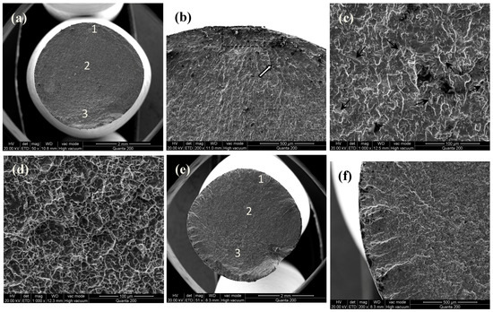 Fatigue fracture surfaces of untreated specimen at different stresses: (a) fracture surface at 450 MPa; (b) area “1” 200×; (c) local amplification of area “2”; (d) local amplification of area “3”; (e) fracture surface at 700 MPa; (f) cleavage striations in material surface layer.