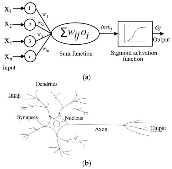 Figure 1 displays a schematic illustration of both artificial and biological neurons. An artificial neural network is a highly interconnected network of parallel distributed possessors or neurons that has a learning process similar to the extent of the learning procedure in a biological brain [,,,,,,,]. It operates as a black box through a learning process with the ability to synthesize and memorize complex data structure [].