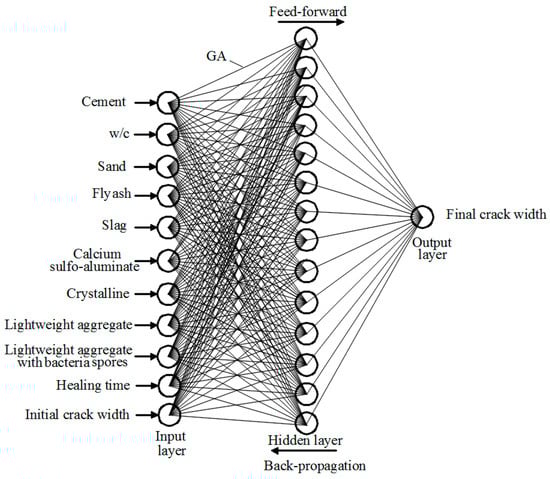 In the majority of engineering applications of ANNs, the supervised training method based on feed-forward network along with a back-propagation algorithm was implemented [,,,]. According to Yeh [], developing an ANN model capable of predicting the behavior of a material requires training the network on the targeted data obtained from experimental results of that material. In other words, it requires training the network in a supervised manner. Thus, in the present study, feed-forward neural networks (FFNs) along with back-propagation algorithm was implemented to train the GA–ANN model on predicting self-healing in concrete.