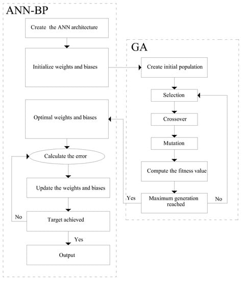 In the present paper, GA was applied to optimize the evolution of weights and biases as shown in Figure 3. Therefore, mutation and crossover only apply to the weights and biases to find the optimal values. After achieving optimal weights and biases, the model is trained using a BP algorithm.