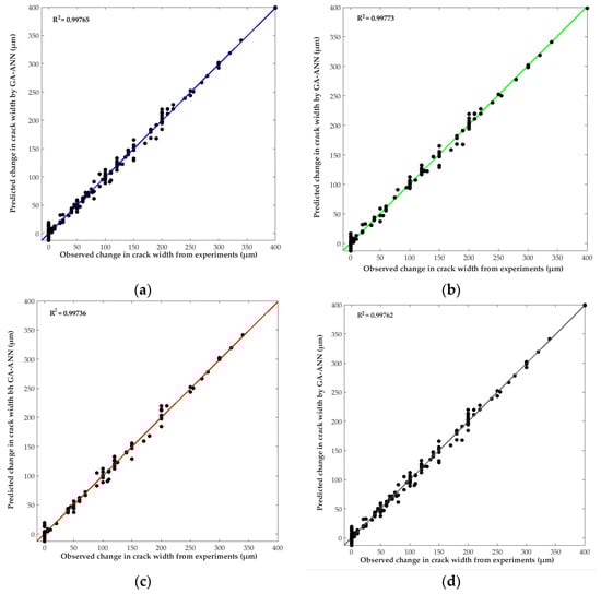Regression plot of GA–ANN predicted change in crack width due to self-healing versus the corresponding experimentally observed change in crack width: (a) training; (b) validation; (c) test; and (d) complete data set.