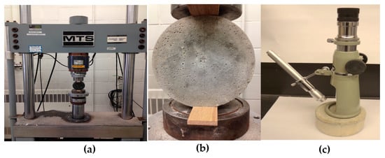 Crack development in mortar specimens tested for self-healing: (a) loading procedure; (b) crack development; and (c) crack width measurement using a microscope.