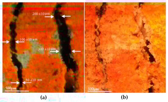 Crack healing process: (a) cracks before healing; (b) cracks after 42 days of healing.