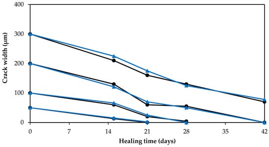 Autogenous self-healing in concrete can also be stimulated by incorporating different healing agents into the concrete matrix. For instance, previous studies by Termkhajornkit et al. [], Şahmaran et al. [] and Van Tittelboom et al. [] showed that partially replacing Portland cement with supplementary cementitious materials, such as blast-furnace slag and fly ash, can improve the self-healing phenomenon in the cementitious matrix. In addition, a study by Sisomphon et al. [] reported that using expansive and crystalline additives could also enhance self-healing.