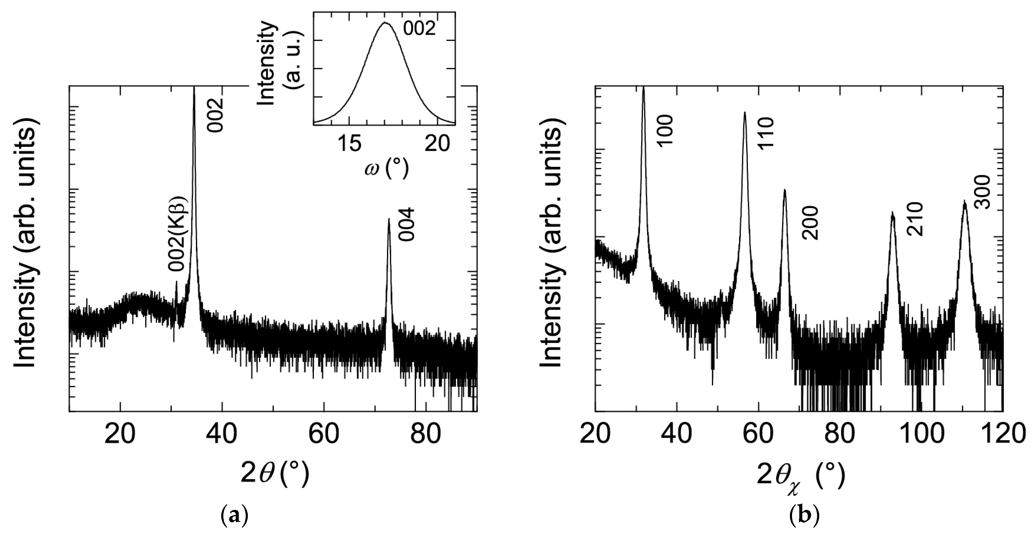 (a) θ–2θ scan (out-of-plane) with 002 ω scan; and (b) 2θx–ϕ scan (in-plane) XRD patterns of a ZnO:Al (2.0 wt %) film.