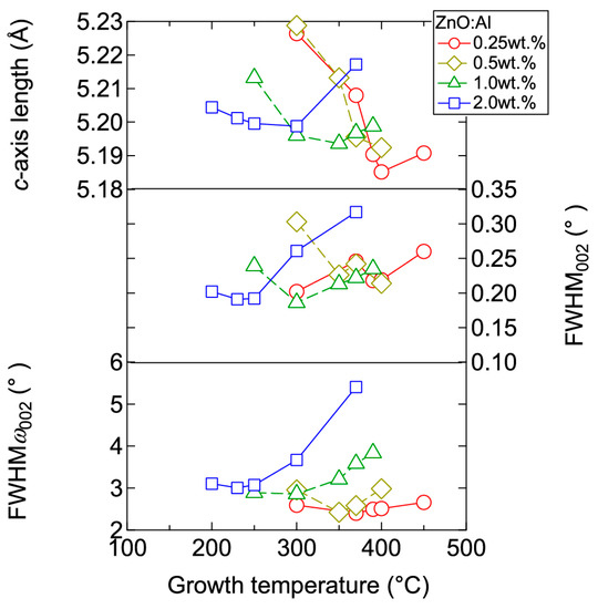 Figure 3 displays plots of the c-axis length, the full width at half maximum (FWHM) of the 002 diffraction peak (FWHM002), and the FWHM of rocking curves for the 002 diffraction peak (FWHMω002) as a function of Tg for the ~240-nm-thick ZnO:Al films. Here, FWHM002 reflects the out-of-plane crystallite size and the differences in c-axis length along the growth direction due to non-uniform micro-stresses, whereas FWHMω002 reflects the c-axis tilt. For each ZnO:Al film with a given Al content, FWHM002 and FWHMω002 decreased gradually with increasing Tg up to a certain optimal temperature (Topt), while these values increased above Topt. The values of Topt were 250, 300, 350, and 370 °C for ZnO:Al films fabricated using ZnO ceramic targets containing 2.0, 1.0, 0.5, and 0.25 wt % Al2O3, respectively. Topt decreases with increasing Al content. The variation of the FWHM values can be explained as follows: The diffusion length of adatoms and precursors at the growth surface increase with Tg up to Topt, thereby leading to greater crystallinity in the films. Conversely, further increases in Tg would significantly promote diffusion of the adatoms and precursors, leading to migration of ions in the bulk films, and desorption of Zn at the growth surface. Consequently, excess Al may degrade the film crystallinity by forming local atomic structures similar to a homologous phase ((ZnO)mAl2O3) [14,15]. The effect of inserting homologous phases in a ZnO film would be to increase the out-of-plane dimension of the film. Indeed, we observed an increase in the c-axis length at Tg above Topt (Figure 3).