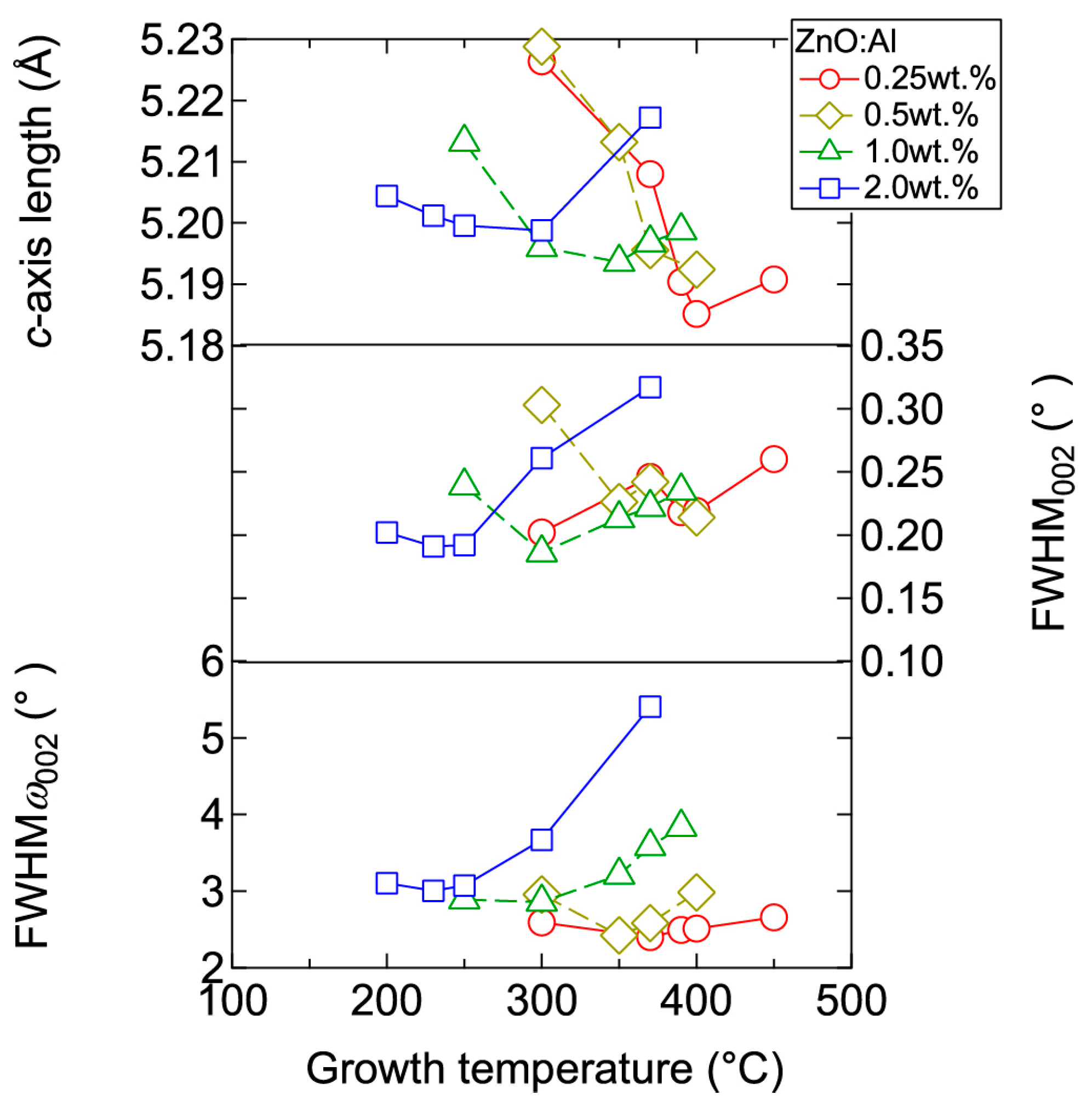 Plots of c-axis length, the full width at half maximum (FWHM) of the 002 diffraction peak (FWHM002), and the FWHM of rocking curves for the 002 diffraction peak (FWHMω002) as a function of growth temperature for ZnO:Al (0.25, 0.5, 1.0, and 2.0 wt %) films.