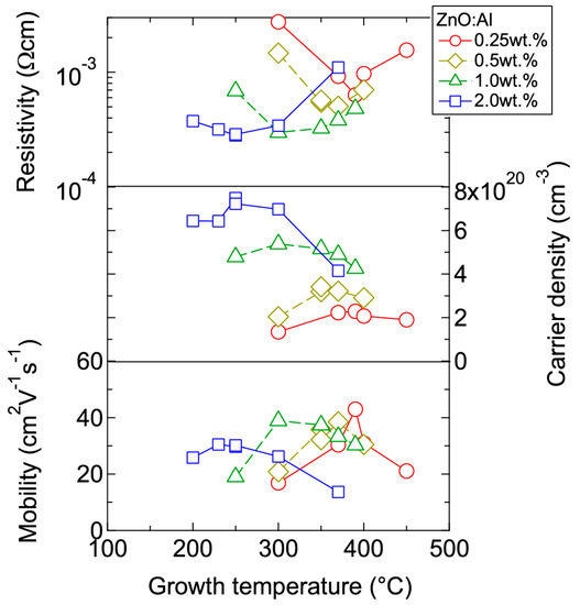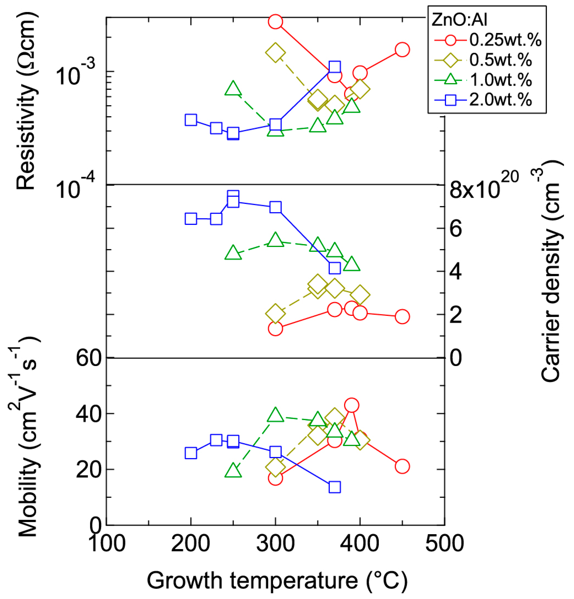 Plots of resistivity, carrier density, and mobility in ZnO:Al (0.25, 0.5, 1.0, and 2.0 wt %) films as a function of growth temperature.