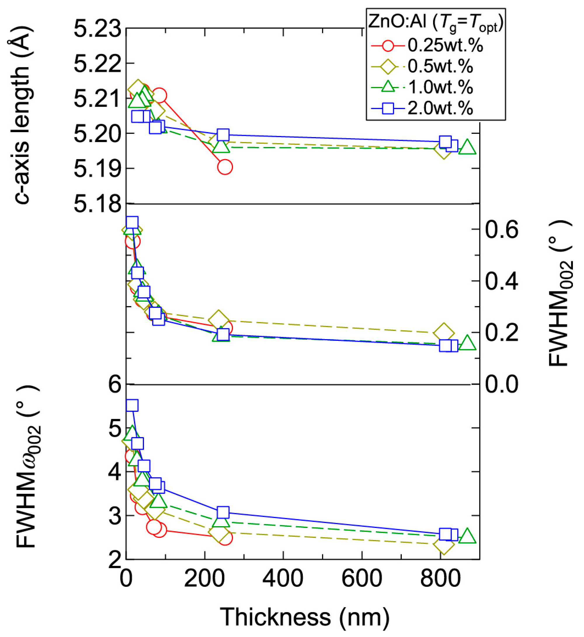 Plots of c-axis length, the FWHM of the 002 diffraction peak (FWHM002), and the FWHM of rocking curves for the 002 diffraction peak (FWHMω002) as a function of thickness for ZnO:Al (0.25, 0.5, 1.0, and 2.0 wt %) films.