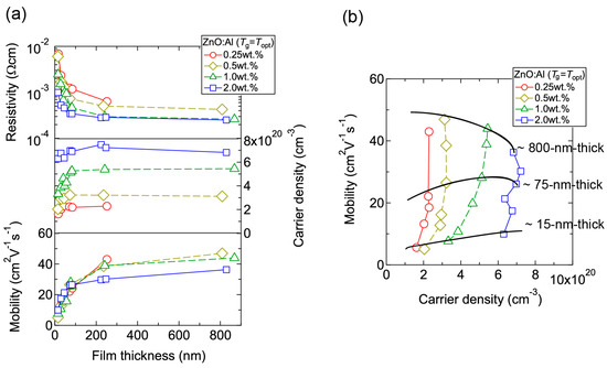 (a) Plots of resistivity, carrier density, and mobility in ZnO:Al (0.25, 0.5, 1.0, and 2.0 wt %) films as a function of film thickness; (b) Relationship between carrier density and mobility for the films.