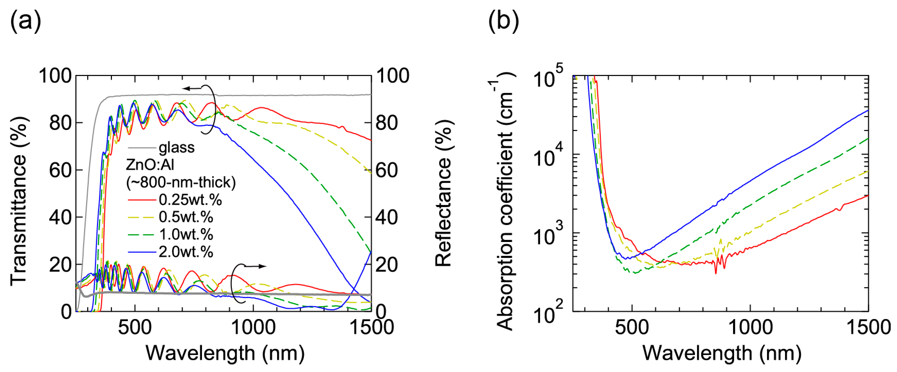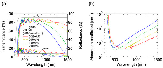 (a) Transmittance and reflectance; and (b) absorption coefficient spectra of the ~800-nm-thick ZnO:Al (0.25, 0.5, 1.0, and 2.0 wt %) films.