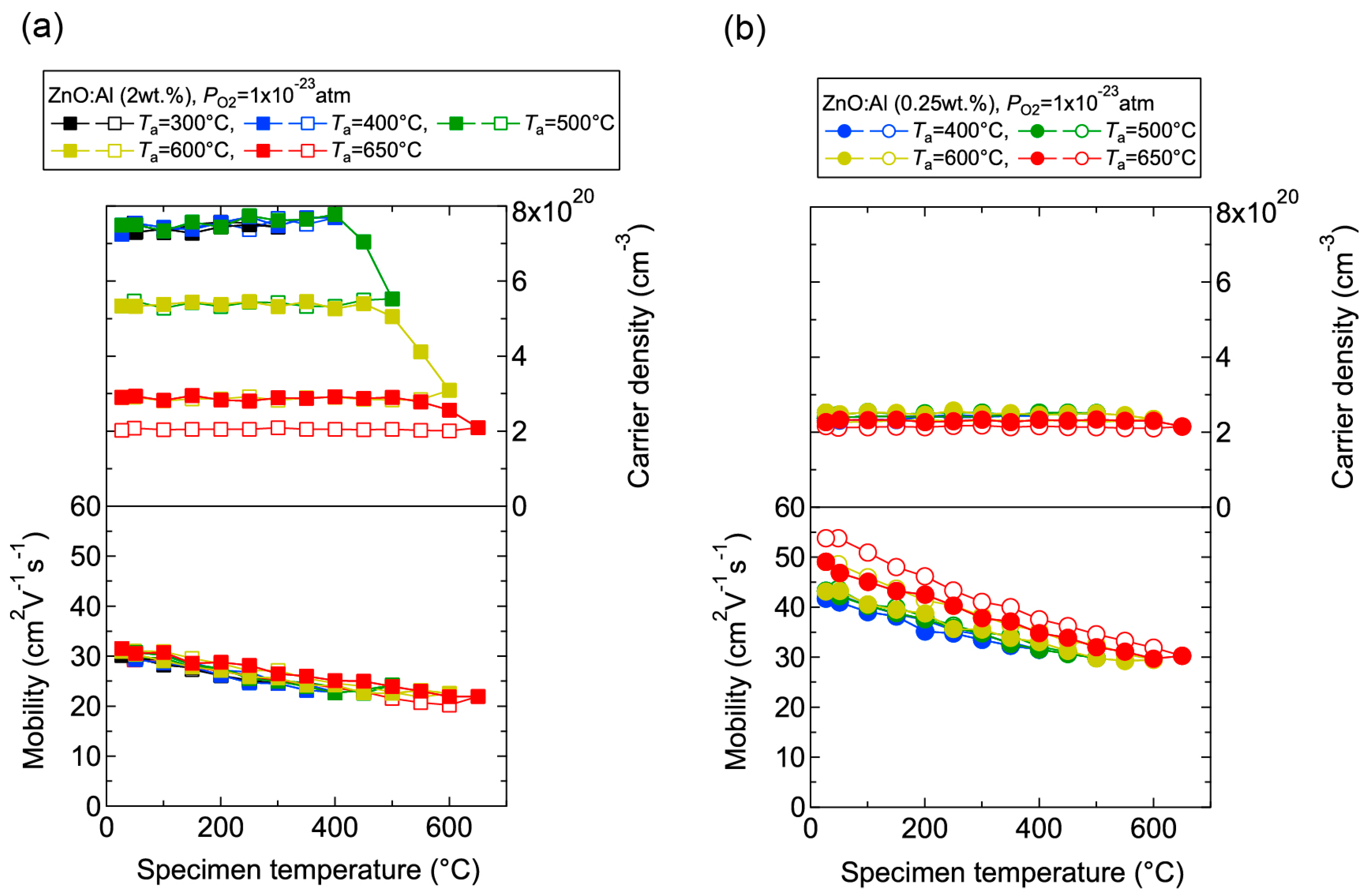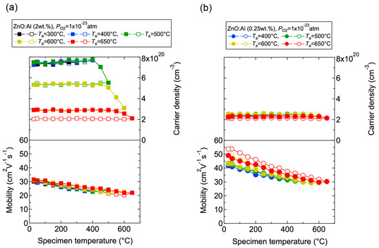 Changes in carrier density and mobility in (a) ZnO:Al (2.0 wt %) and (b) ZnO:Al (0.25 wt %) films as a function of specimen temperature during post-annealing treatments at a PO2 of 1 × 10−23 atm.