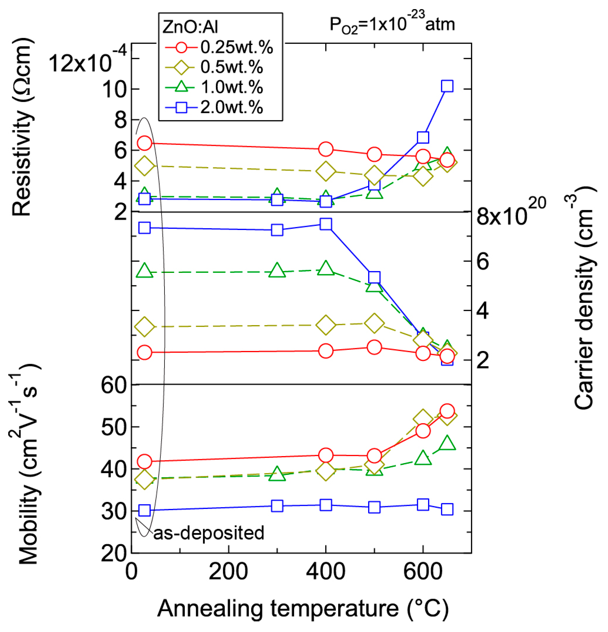 Room-temperature resistivity, carrier density, and mobility in ZnO:Al (0.25, 0.5, 1.0, and 2.0 wt %) films as a function of annealing temperature. Post-annealing was performed at a PO2 of 1 × 10−23 atm.