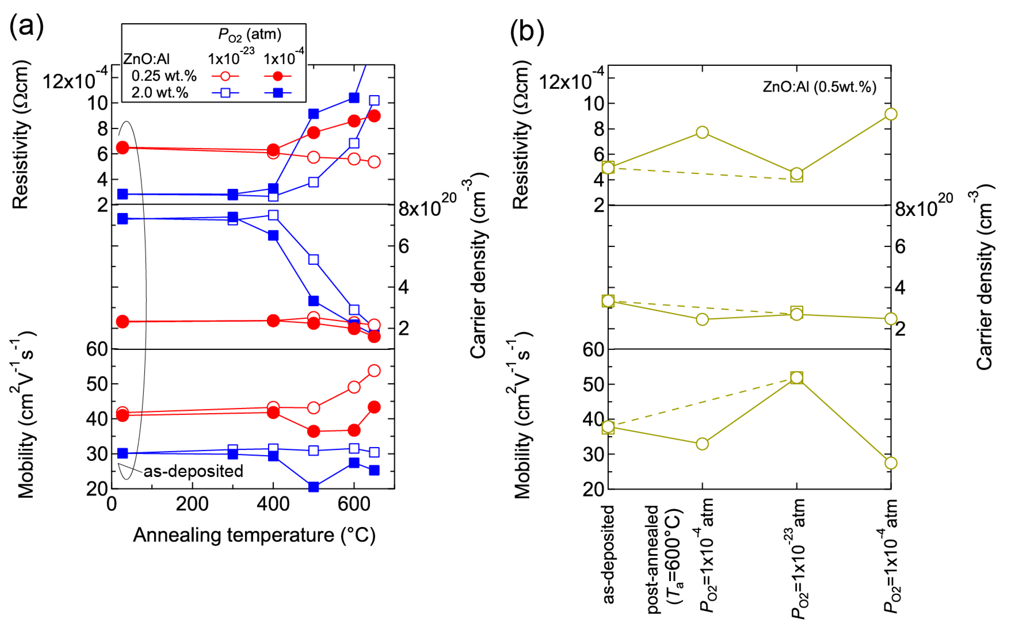 Room-temperature resistivity, carrier density, and mobility in (a) ZnO:Al (0.25 and 2.0 wt %) films plotted as a function of annealing temperature at PO2 values of 1 × 10−23 and 1 × 10−4 atm and (b) two ZnO:Al (0.5 wt %) films post-annealed at 600 °C under various PO2 values.