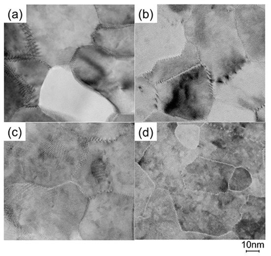 Plan-view TEM images of the as-deposited films of (a) ZnO:Al (0.25 wt %) and (b) ZnO:Al (2.0 wt %); and post-annealed films of (c) ZnO:Al (0.25 wt %) and (d) ZnO:Al (2.0 wt %) films at 650 °C at a PO2 of 1 × 10−23 atm.