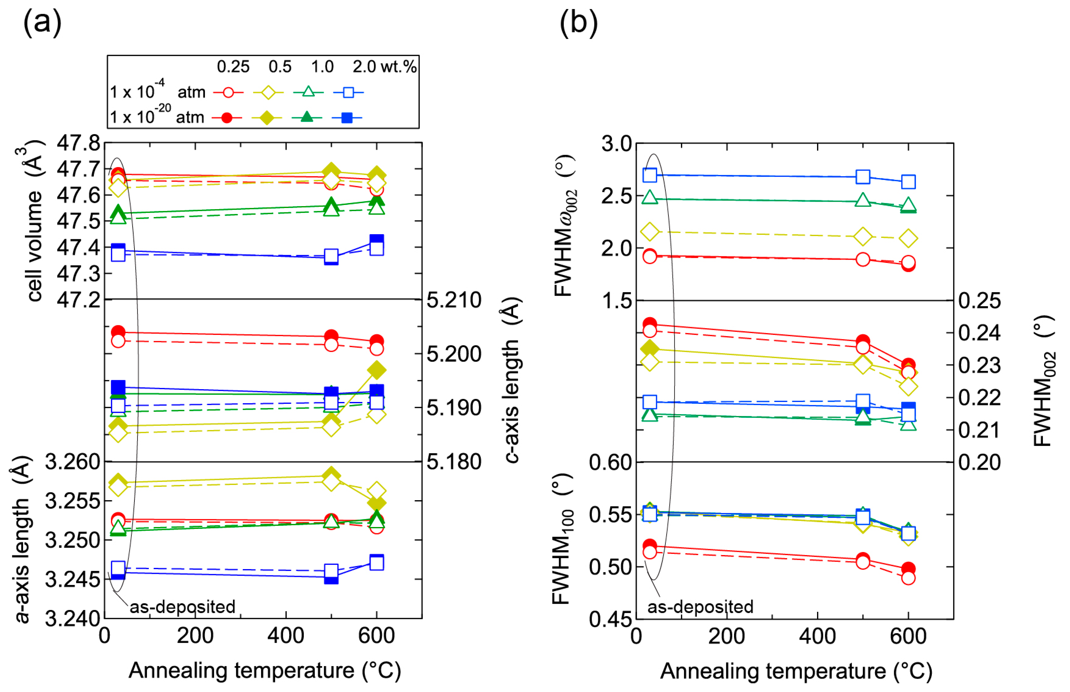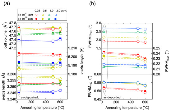 Plots of (a) a- and c-axis lengths and cell volumes as a function of annealing temperature, and (b) FWHM of rocking curves for 002 diffraction peaks (FWHMω002) and FWHM of 002 and 100 diffraction peaks (FWHM002, FWHM100) as a function of annealing temperature for films post-annealed at a PO2 of 1 × 10−20 (solid lines) and of 1 × 10−4 (dotted lines) atm.