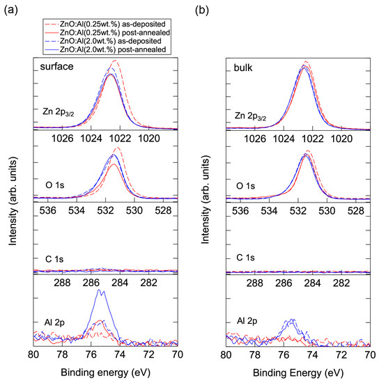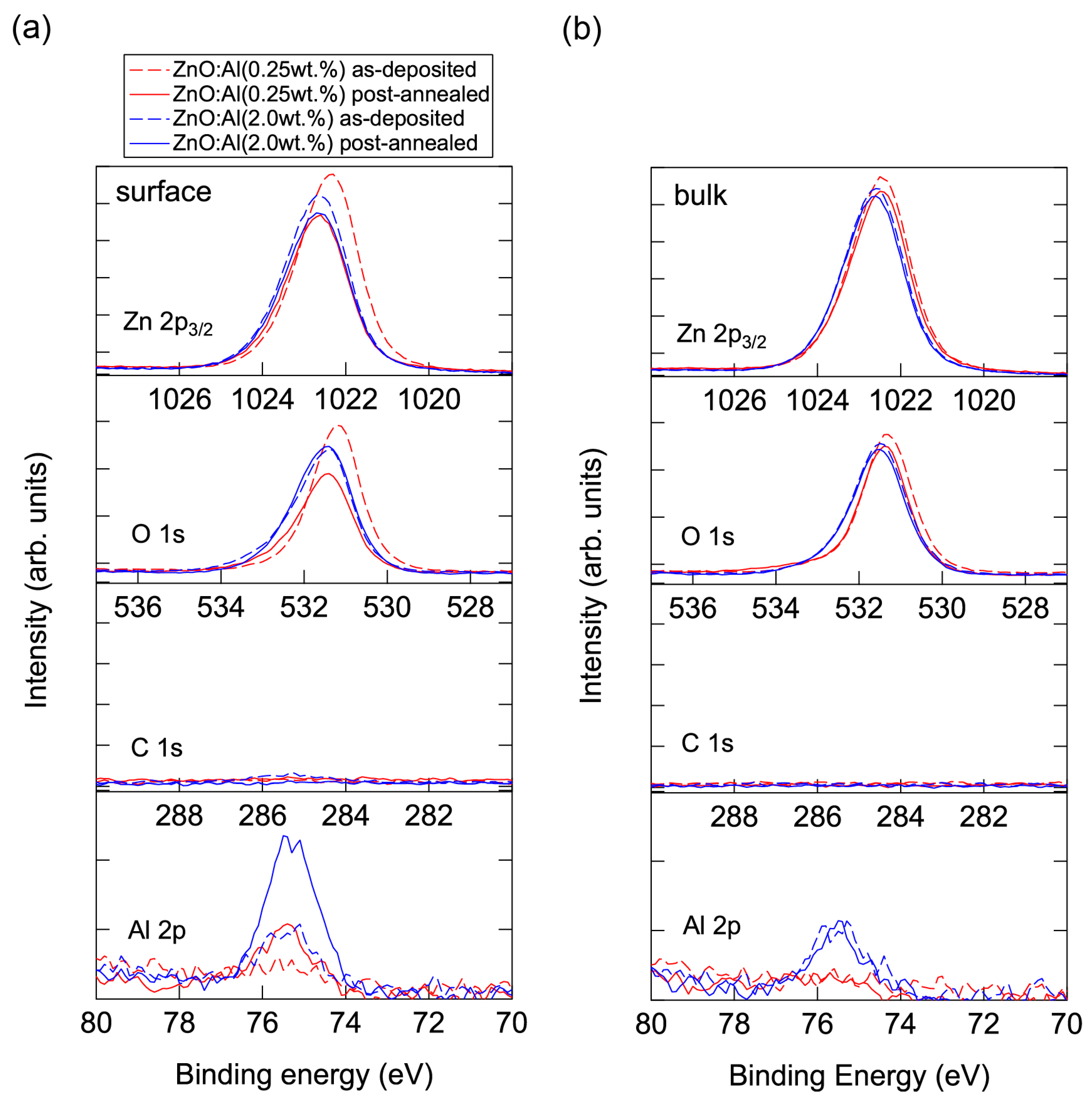 XPS spectra for (a) the surface regions and (b) the bulk regions of the as-deposited and post-annealed ZnO:Al (0.25 and 2.0 wt %) films at a PO2 of 1 × 10−23 atm.
