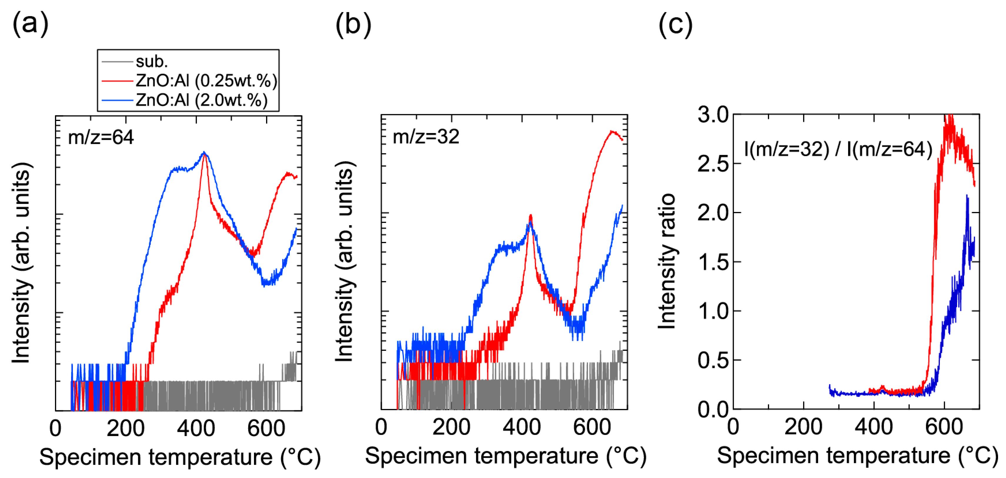 TDS spectra of desorption species with masses (m/z) of (a) 64 and (b) 32 from ZnO:Al (0.25 wt %) and ZnO:Al (2.0 wt %) films grown at optimized temperatures; (c) The intensity ratio of m/z = 32 to m/z = 64.