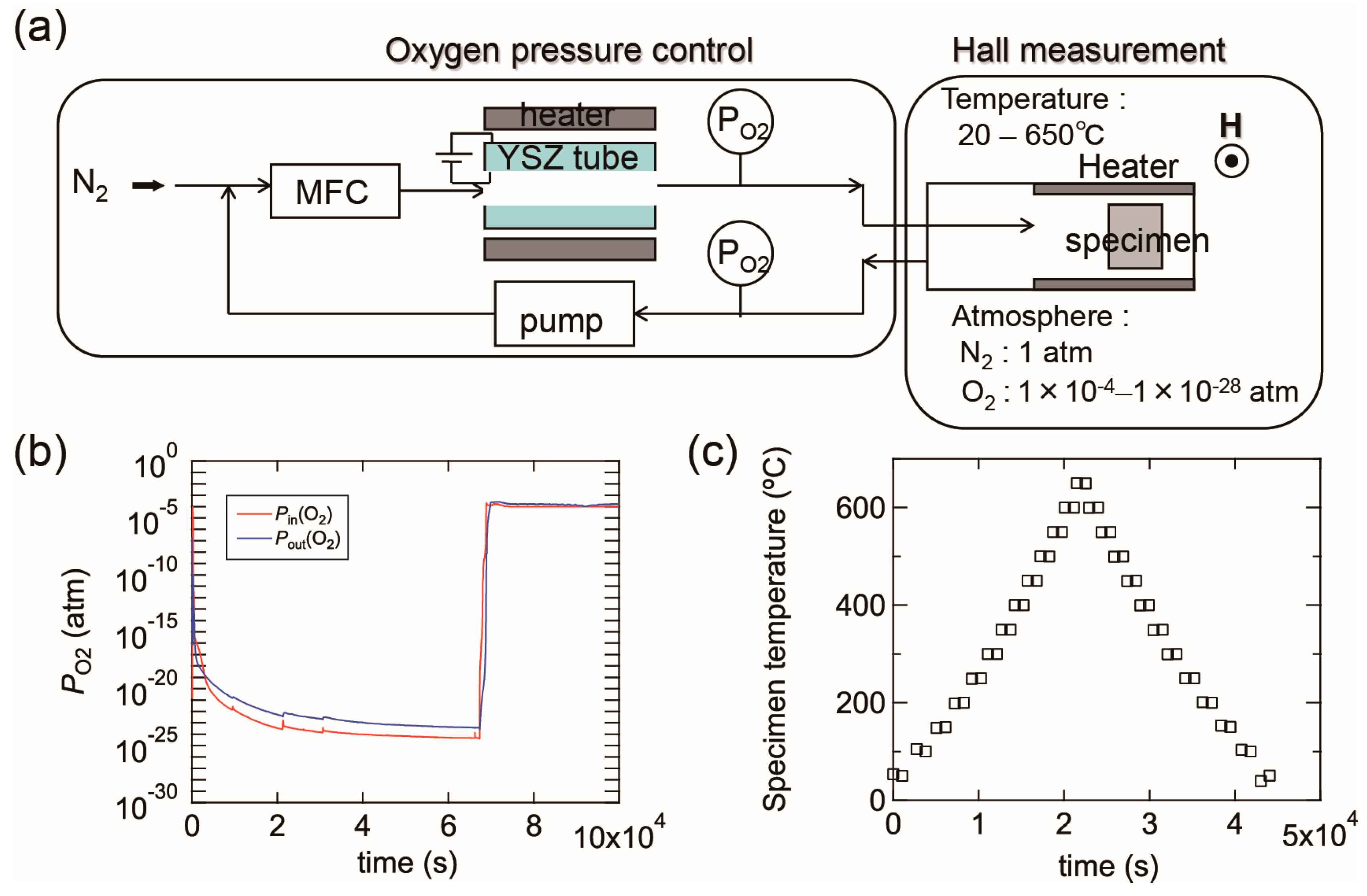 (a) A schematic image of our experimental setup composed of an oxygen pump and a Hall measurement system; (b) example diagram of PO2 variations as a function of time. The PO2 was controlled by changing the electric field between the inner and outer electrodes of a solid electrolyte tube made of yttria-stabilized zirconia (YSZ); (c) temperatures during (ρ, n, μ) measurements as a function of time. In this measurement, the electrical properties were measured every 50 °C during heating from 50 to 650 °C and subsequent cooling from 650 to 50 °C.