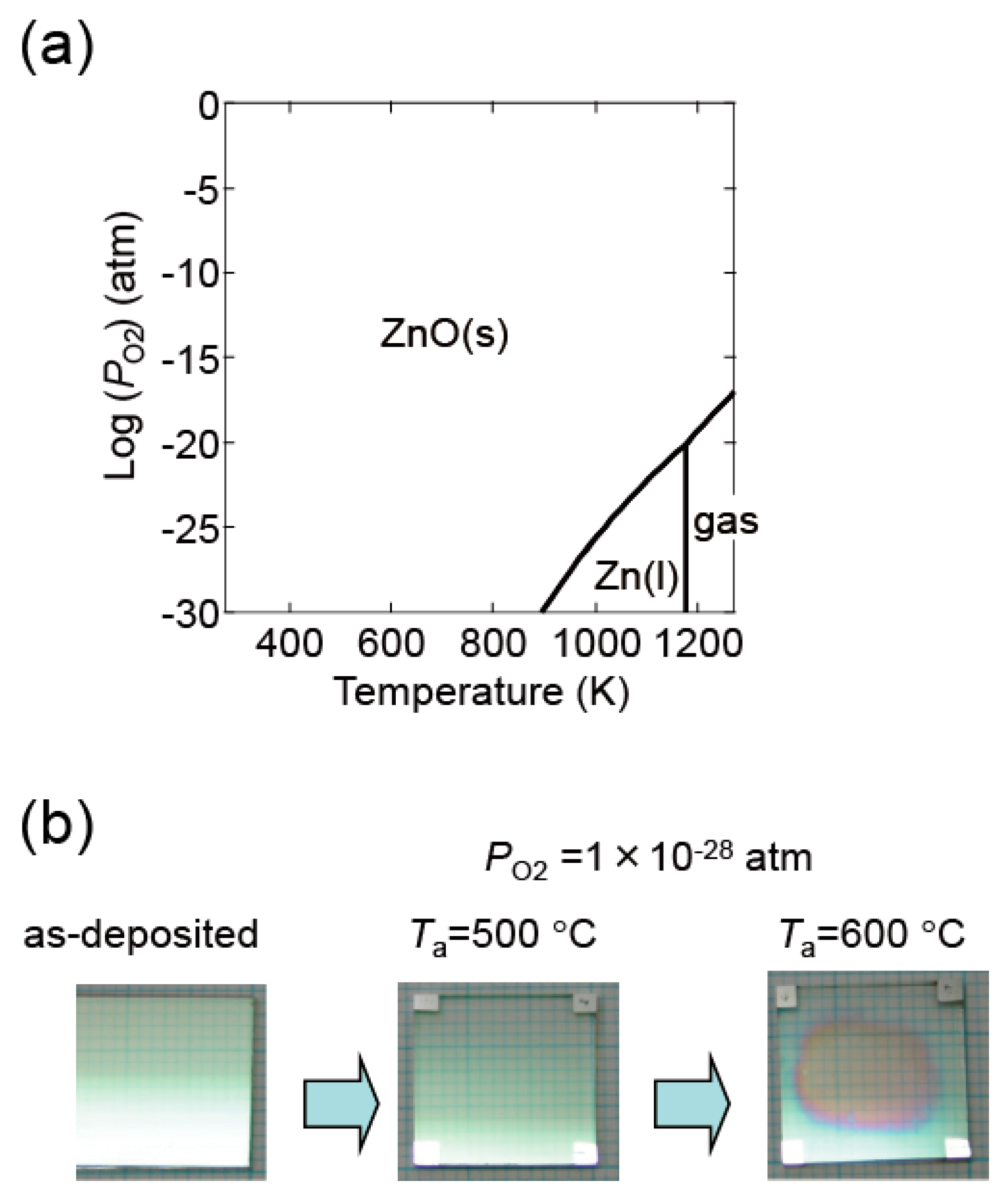 (a) Diagram indicating the conditions of thermodynamic equilibrium between ZnO and Zn + 1/2O2 for pure ZnO; (b) images of a ZnO:Al (0.25 wt %) film before and after post-annealing at 500 and 600 °C at a PO2 of 1 × 10−28 atm using the Hall measurement system.