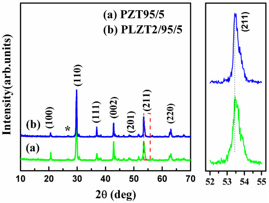 Figure 1 presents XRD patterns of sintered PLZT2/95/5 ceramics samples. From the XRD patterns, we can observe the additional peaks (*), which matched with the pyrochlore phase. These phases arose due to the volatization of PbO and over sintering at high temperature [21]. The phase structure of the AFE ceramics was slightly affected by the chemical modification of the PLZT2/95/5 ceramics. It can be seen that the position of the peak (211) shifted to high degrees because the ionic radii of Pb2+ (0.149 nm) are larger than that of La3+ (0.136 nm), which indicated smaller lattice parameters of PLZT2/95/5 ceramics.