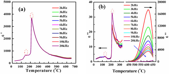 Temperature dependence of the real ε' and imaginary ε'' parts of relative permittivity for PLZT2/95/5 ceramics at various frequencies are plotted in Figure 2. The relative dielectric permittivity ε' displayed almost the same under different frequencies, as we can clearly see in Figure 2a. The relative permittivity curves exhibited anomalous peaks with hollow circles at about 155 °C and 225 °C, respectively. The small anomalous peak was interpreted by the phase transition AFE to FE [22,23] (To = 155 °C), whereas the maximum anomalous peak was linked with the transformation of FE to PE phase (TC = 225 °C) at the higher temperature. The samples exhibited FE and AFE coexistence state when T exceeds To and PE state when T exceeds TC [3]. The dielectric data in Figure 2a were maximum for a temperature of about 225 °C, which was in line with the FE curie temperature (TC = 225 °C) obtained in PLZT2/95/5 bulk materials [24,25] or about 222 °C in PLZT2/95/5 thick films [26]. No dielectric peak related to an intermediate transition from the AFE phase to the slim loop FE phase reported in bulk materials can be resolved in the whole temperature range studied [24,25]. In Figure 2b, two anomalies in imaginary ε'' parts of relative permittivity were observed with hollow circles, which is consistent with the dielectric measurements. The first anomaly occurred near the AFE to FE transition temperature, whereas the second one took place around the FE to PE transition temperature. The similar phenomenon was reported by some researchers [5,22,23]. Moreover, it had been demonstrated using Figure 3 where Figure 3 showed the two states of ferroelectric hysteresis observed in AFE materials. However, it is interesting to note that the value of dielectric loss was very large, and prominent and wide humps were observed in the temperature region of 600–650 °C from 2 to 20 kHz, which were attributed to the space charge polarization or the conductivity of insulating ceramics increases with increase in temperature [27]. The same phenomenon had also been reported in several perovskites with the temperature range of 400–800 °C [28]. The high temperature relaxation does not have relationship with the phase transitions, which looks like the behavior of the diffuse phase transition. Dielectric relaxation in FE materials is very sensitive to temperature, electric field, ionic substitution, intrinsic defect and domain configuration, because they are able to modify the polarization configuration [29].