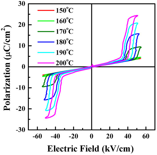 Ceramic samples were polished to the thickness of 0.8 mm for the measurement of electrical properties. Both sides of samples were electroded with silver paste and sintered at 650 °C for 2 h. The crystal structure and orientation of the ceramic samples were characterized by using an X-ray diffractometer (XRD, D/MAX 2200 VPC, Rigaku, Tokyo, Japan) with working current and voltage of 20 mA and 36 kV, respectively. The temperature dependence of dielectric and impedance properties were measured by Agilent E4980A in the temperature range of 26–650 °C with the heating rate 3 of °C/min. The polarization-electric field (P-E) loops were characterized by Radiant Technologies Precision premier II (Albuquerque, NM, USA) over the temperature range of 30–200 °C.