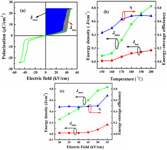 Figure 4a illustrates the recoverable energy-storage density Jreco (the blue area) of the PLZT2/95/5 ceramics at 200 °C. Generally, the energy storage density could be estimated from the P-E loops, which was calculated with the following equations [31]: