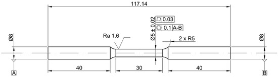 Specimen geometry (see Figure 2) and testing method for tensile test were selected according to literature review [23,24,25], as well as to comply to ISO 6892-1:2016 [26] and ASTM E8/E8M-16a [27] standards. Instron 1185 testing machine was used to evaluate tensile properties at room temperature, with a displacement rate of cross head of 0.0075 mm/s.