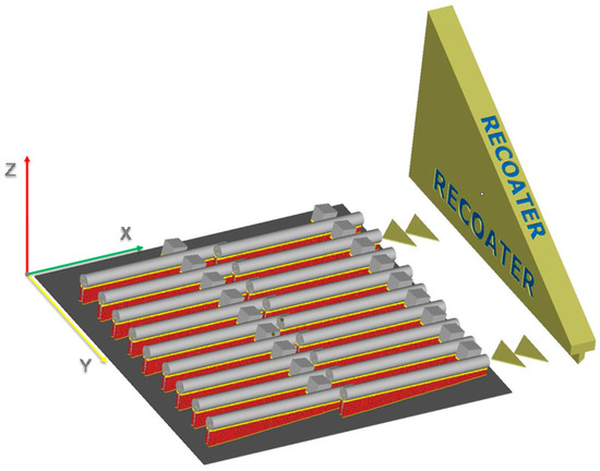 The position of specimens referring to a particular treatment was completely randomized within each printing job, in order to eliminate the influence of their position on the printing plate. In addition, all specimens were produced with a build angle of 4°, in order to minimize residual stresses, and with an angle of 4.78° with respect to the re-coating direction, to minimize fluttering effects due to the coater motion. The laser travel direction was rotated by 67° each layer. The printing job layout is shown in Figure 4.