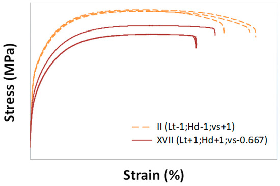 Stress–strain curves for specimens produced by using process parameters corresponding to treatments II and XVII.