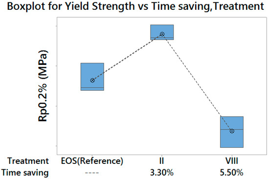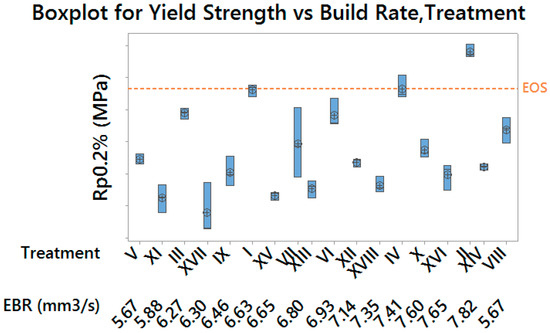 Boxplot for Yield Strength (grouped by build rate and treatment)—vertical scale unit 10 MPa.
