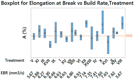 Boxplot for Elongation at Break (grouped by build rate and treatment)—vertical scale unit 1%.