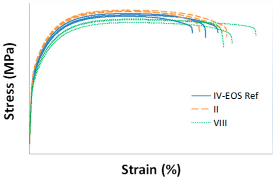 Stress–strain curves for specimens produced by using process parameters corresponding to treatments IV (default), II and VIII.