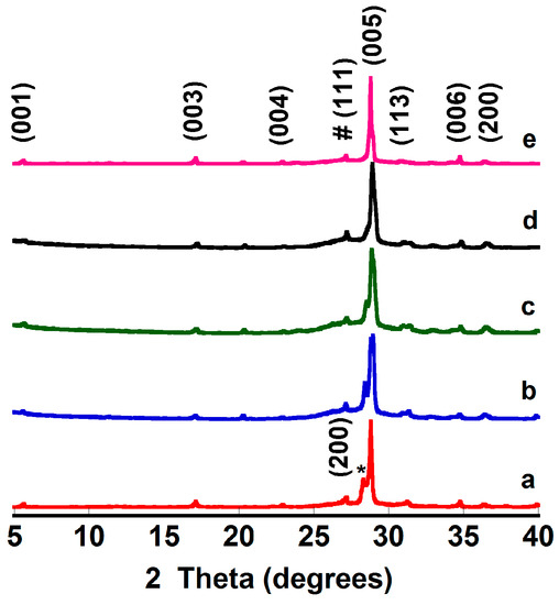 Powder X-ray diffraction (XRD) patterns of thermally-treated [Bi2Ba2O4]0.5[CoO2] samples as a function of time at 700 °C: (a) 0; (b) 24; (c) 96; (d) 384; and (e) 1536 h. Crystallographic planes are indicated for the [Bi2Ba2O4]0.5[CoO2] phase; * Bi-Ba-O solid solution; and # Ge, used as internal reference.