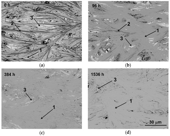 The microstructural evolution of samples as a function of the thermal treatment length is illustrated in Figure 2 (only 0, 96, 384, and 1536 h thermally-treated samples are shown for clarity). At a first sight, a significant change between as-grown (a) and thermally-treated (b, c, and d) samples can be observed. In as-grown samples, three contrasts can be observed, associated through EDS analysis to different phases. Grey contrast (#1) corresponds to the [Bi2Ba2O4]0.5[CoO2] phase thermoelectric phase, while dark grey and white ones (#2 and #3, respectively) have been identified as Ba-Co-O and Bi-Ba-O solid solutions, respectively.