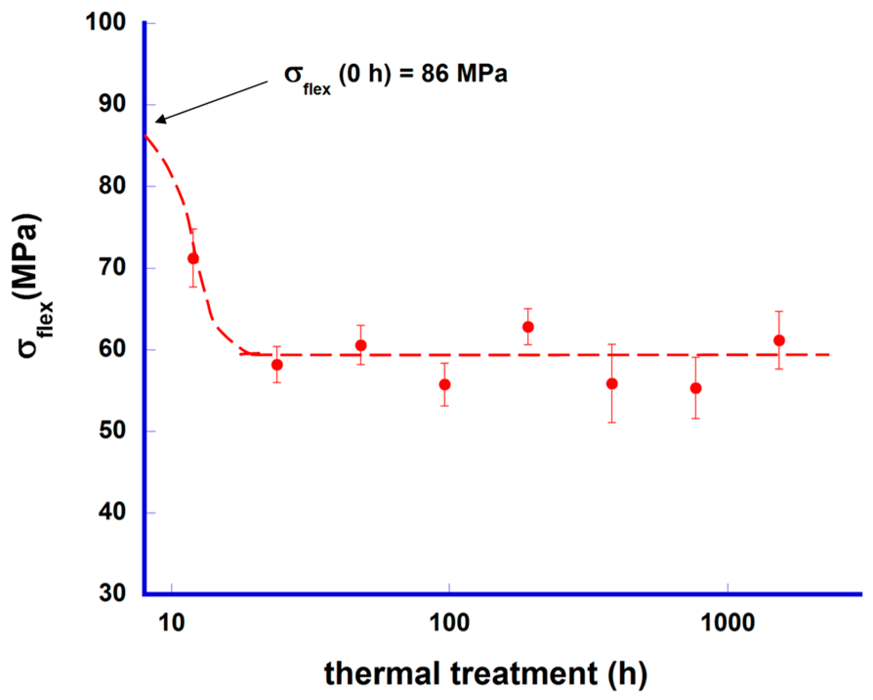 Mechanical performance (three-point bending) of [Bi2Ba2O4]0.5[CoO2] samples together with their standard error as function of time at 700 °C. Mechanical strength for the as-grown sample (0 h) is marked by an arrow.