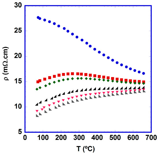 From these data, it is clear that electrical resistivity is decreased as the duration of thermal treatment is increased. Moreover, these changes are more important in the first few hours of the thermal treatment, in agreement with the rapid decrease of secondary phases in the samples, as has been previously discussed in the mechanical properties section. On the other hand, the electrical characteristics of the samples changed from a semiconducting-like behaviour for the as-grown samples to a more metallic one for the thermally-treated specimens as a result of the increase of the TE phase and the possible oxygenation process produced in the thermal treatment under air. The lowest values were obtained for samples held a 700 °C for 1536 h (~8 and ~13 mΩ·cm at 50 and 650 °C, respectively). The values at room temperature are lower than those previously reported in textured [Bi2Ba2O4]0.5[CoO2] materials (10–250 mΩ·cm) [16,36,37,38], and relatively close to the values determined in single crystals along the ab plane (4 mΩ·cm) [13,39]. Finally, the high temperature values are clearly lower than the ones found in [Bi2Ba2O4]0.5[CoO2] sintered materials (33 mΩ·cm) [15,39], and comparable with those obtained in textured samples (between 8 and 50 mΩ·cm) [16,36,38].