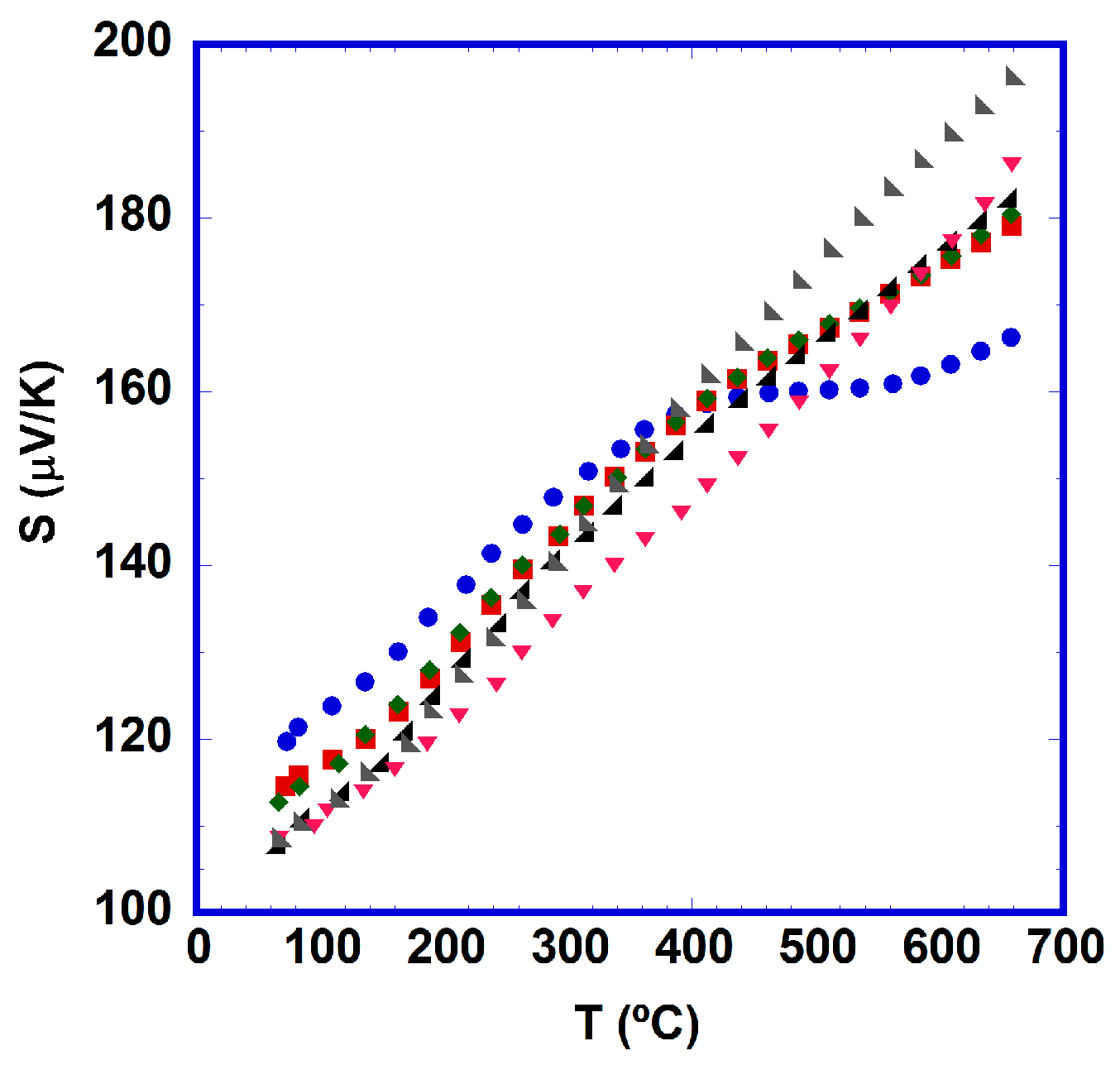 Temperature dependence of the Seebeck coefficient for [Bi2Ba2O4]0.5[CoO2] samples as a function of time at 700 °C (●, 0; ■, 12; ◆, 24; ◢, 96; ▼, 384; ◣, 1536 h).