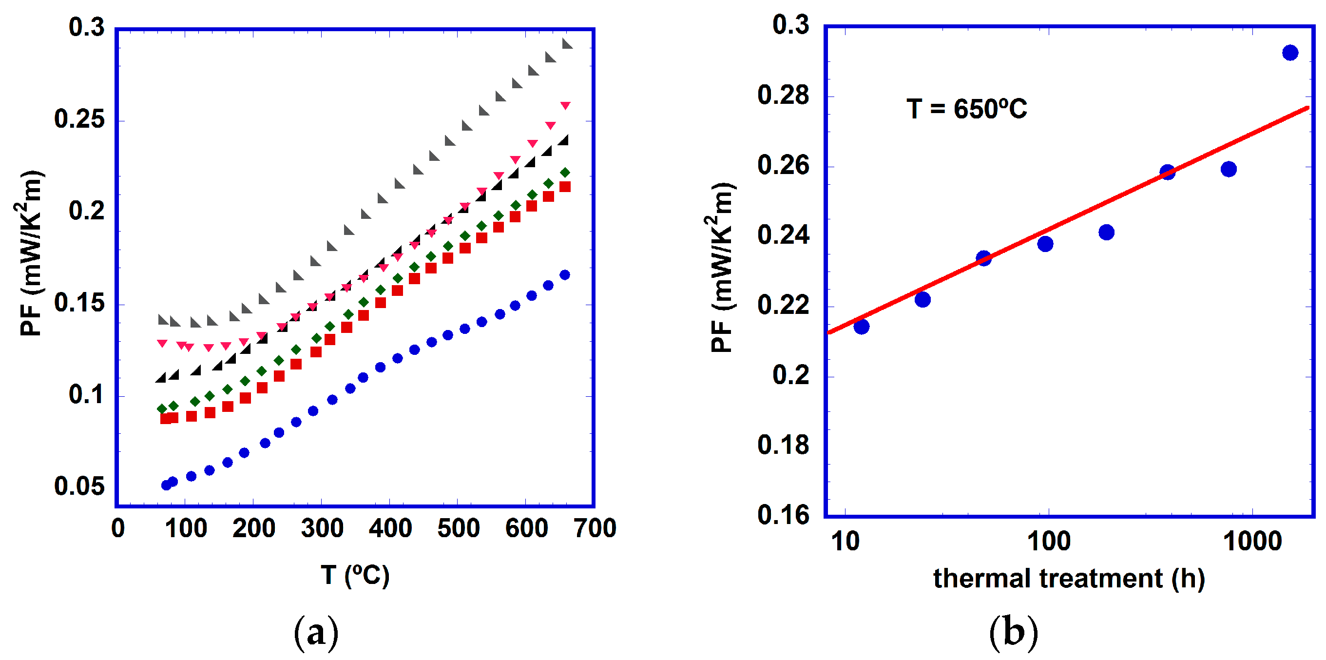 From the electrical resistivity and Seebeck coefficient data, PF evolution as a function of temperature was calculated and is displayed in Figure 6a. As can be clearly seen, an increment in the measured TE performance is obtained with longer thermal treatment. These changes are more pronounced in the first few hours of the thermal treatment, in agreement with previous discussions. To better clarify the PF evolution as a function of the thermal treatment duration, PF values at 650 °C are displayed in Figure 6b, where a slight but continuous improvement of the TE characteristics of samples is observed. A logarithmic fit of these data (indicated by a straight line in the logarithmic scale) has been performed, clearly confirming the former assertion. The maximum PF values obtained in this work at 650 °C (~0.29 mW/K2m) are close to the best reported ones in LFZ textured materials—0.40 mW/K2m when they are grown at very low rates (5 mm/h) [16] or 0.45 mW/K2m for Pb-doped ones [38]. When comparing these values with the best ones obtained in sintered materials (0.013–0.040 mW/K2m) [15,41,45], the good TE properties of these aged samples at 700 °C are clearly confirmed.