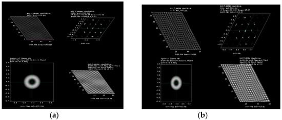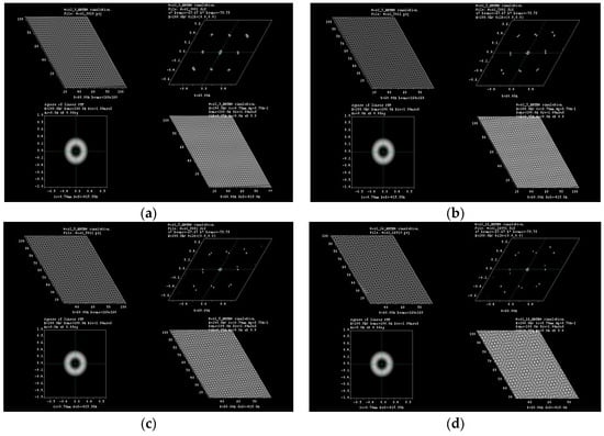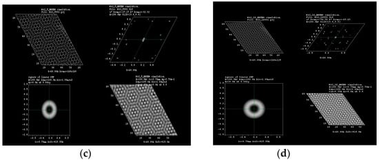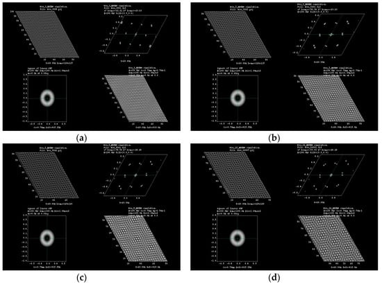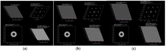 Typical Moiré patterns are observed when two 2D lattices are rotated at a certain angle, and this observation is made directly at their basal plane, usually called (001), over the c-axis direction. We reported these observations previously in experimental HRTEM and simulated them for 2R-MoS2 slabs when rotated about 12° in the c-direction [3,9]. Furthermore, we were able to produce the formation of Moiré patterns on other materials (i.e., tungsten disulfide (WS2), graphene and tungsten diselenide (WSe2)) by achieving this lattice rotation on the molecular models, which created honeycomb-like features, observing as well the formation of new O-lattices as presented in Figure 1 (corresponding to the distance between ending points at the edge of the honeycomb-like structure). Later, those molecular models were subjected to HRTEM simulations, varying a, b coefficients in the projected potential as described by Equation (1) in Section 3.1. The as-simulated sequence of images is presented in Figure 2, Figure 3, Figure 4 and Figure 5; it is possible to determine the formation of a large O-lattice with a non-defined honeycomb structure for angles of rotation corresponding to 3° and a strong honeycomb structure at 16°. Moreover, the resulting O-lattice was measured digitally using the BIOVIA® Materials Studio crystal builder tool. Our findings are presented (for easy reading) in Table 1 and graphically by the inset of red arrows in Figure 1.