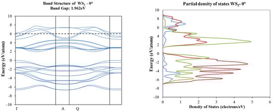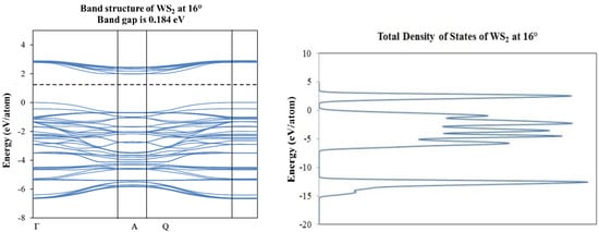 In order to determine the electronic structure of those new O-lattices as created by the angular rotation of the molecular structures, we proceeded with band structures using CASTEP, as described in Section 3.2 and elsewhere [9]. Our results indicated some transitions from metallic into a wide-band-gap semiconductor for the graphene layers, as presented by the band structure and density of states corresponding to 0° and 16° shown in Figure 6. The opposite occurs for the case of the WS2 and WSe2 and MoS2 (presented in Reference [9]) molecular structures, as presented in Figure 7 and Figure 8.