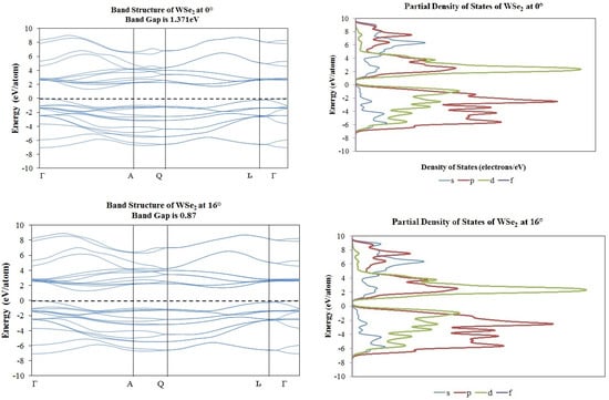 Band structure and partial density of states plots corresponding to 0° (top) and 16° (bottom) of rotation in WSe2 molecular structure.
