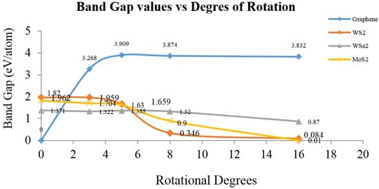 Because of the large data calculations, all band gap values were added and plotted with the degree of rotation, as presented in Figure 9 in band gap vs. degrees of rotation. It is possible to achieve appropriate conclusions by using this fast and low-cost approach helps understand Bollman O-lattice formation due to the “twisting” of two-layered molecular structures, subjected to numerical density functional theory computations. It is possible to achieve high accuracy, as reported before [9], a high-throughput approximation was obtained using the CASTEP algorithm to describe the electronic structure transitions in layered molecular nanostructure materials.