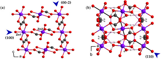 Framework 1 crystallizes under ambient conditions in the P21/c monoclinic space group and has a 3-D network constructed by formates, as previously reported [23]. In the structure, there are two crystallographically independent metal centers coordinated by formate ligands and water molecules [24,25]. Both the zinc ions show a slightly distorted octahedral coordination: Zn1 is coordinated by six formate ligands, and Zn2 is surrounded by two formates and four water molecules (Figure 1a) [23]. These two types of zinc octahedral are linked by bitopic formates and waters to form a 3-D framework. There are two crystallographically independent coordination waters, and they form four independent hydrogen bonds with formate ligands of the framework (Figure 1b).