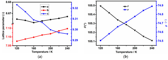 Single-crystal X-ray diffraction experiments were performed at a nitrogen stream condition using an Oxford Diffraction Gemini E Ultra diffractometer (Rigaku Oxford Diffraction Ltd., Oxofrd, UK) with an Eos CCD detector. The crystals were glued on a glass fiber for measurement. Data were collected using Mo-Kα radiation (λ = 0.71073 Å) by the ω scan approach at a temperature between 120 and 240 K at intervals of 20 K. Data collection, cell determination and refinement and data reduction were applied with CrysAlisPro program. The structures were solved and refined using the direct method and full matrix least-squares procedure on F2 by the SHELXS and SHELXL 97 programs [35]. All non-hydrogen atoms with anisotropic thermal parameters were refined and all hydrogen atoms were located from the electron density map and refined using a riding mode and isotropic displacement parameters constrained to 1.2 times those of their adjacent carbon or oxygen atoms.