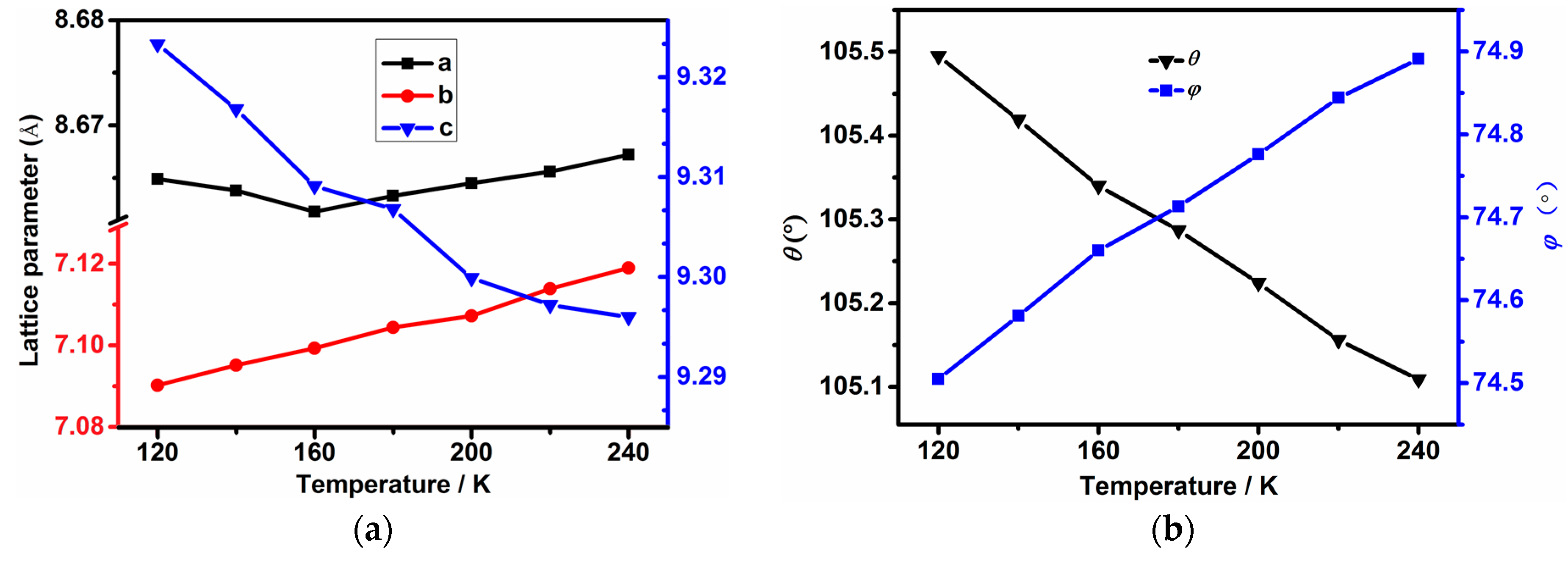 (a) Temperature-dependent principle axis parameters X1, X2 and as a function of temperature; and (b) The temperature dependent variations of hinge angle θ and ϕ.